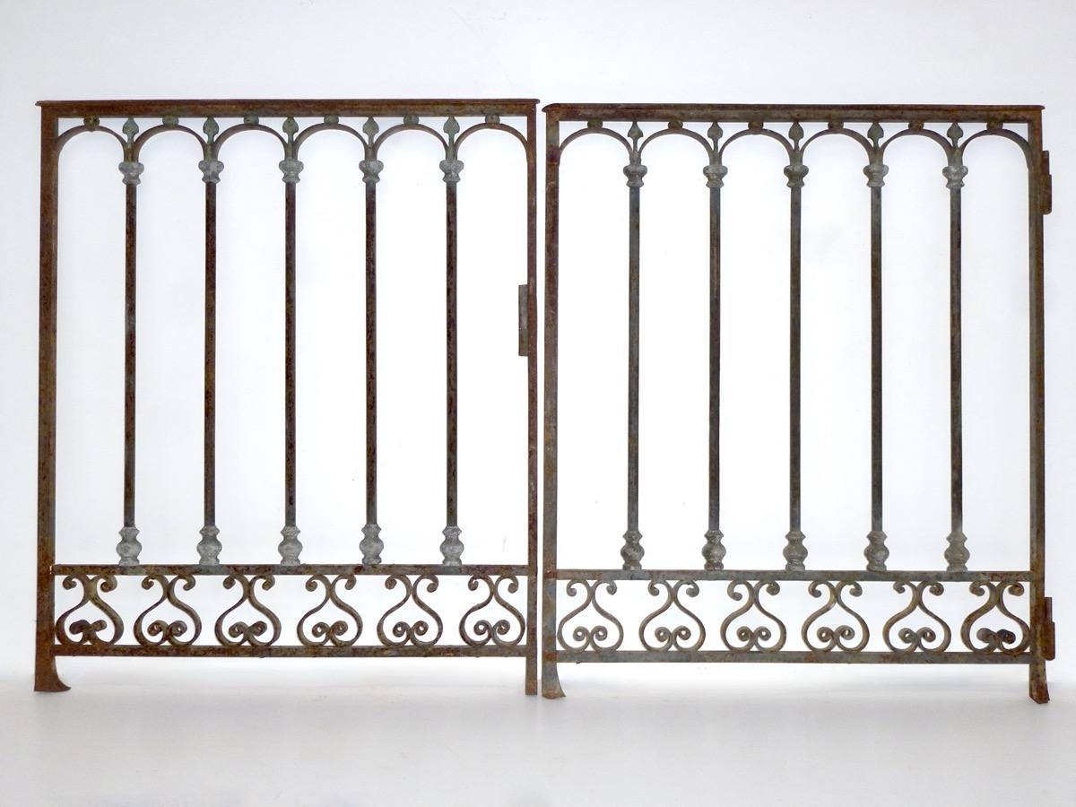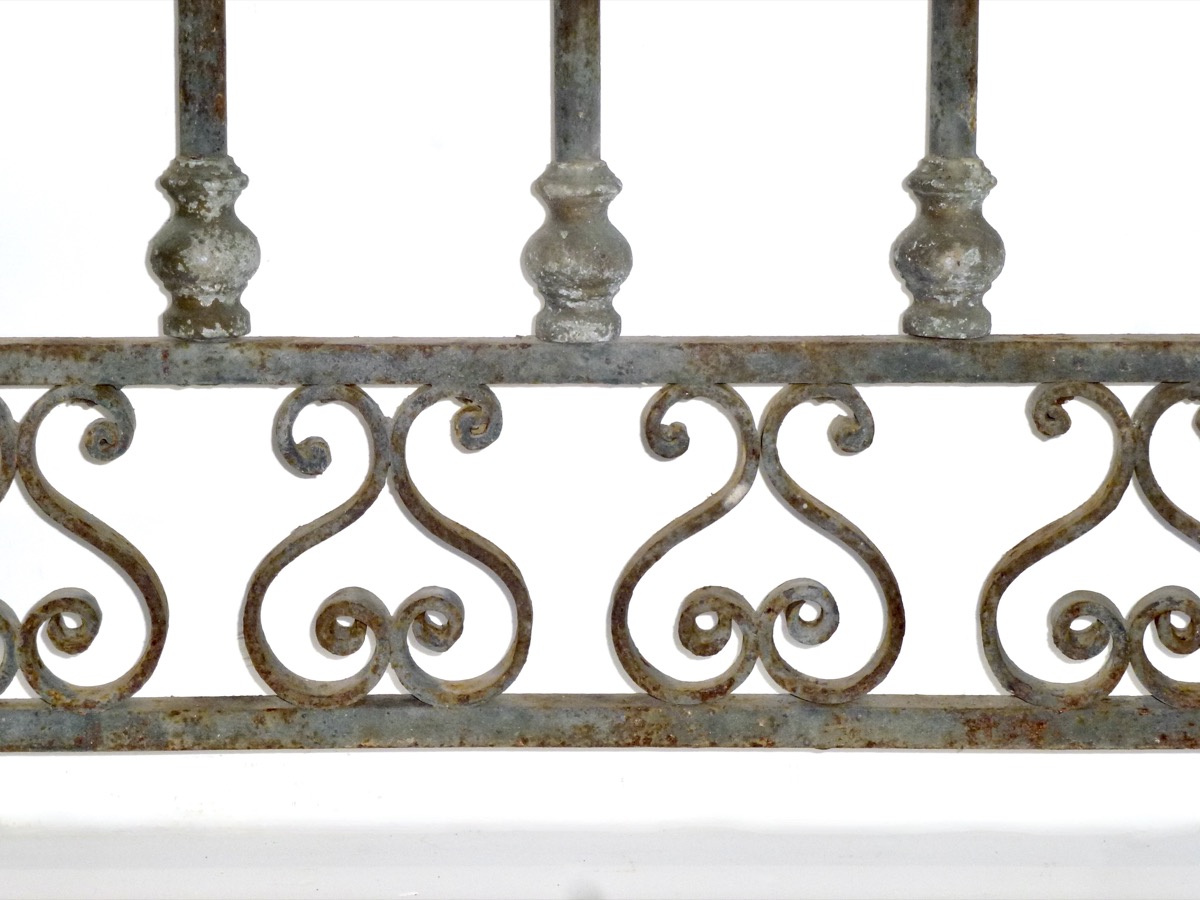 Garde-corps en fer forgé, d'époque XIXème siècle, composé d'un élément de 182 cm, de trois petits éléments fixe de 76 cm chacun et d'un portillon de 75 cm. Il est agrémenté d'une frise supérieure aux cintres à anse de panier, aux barreaux bagués sommés de lancette. Une frise de volutes adossées parcourt ses réserves inférieures.