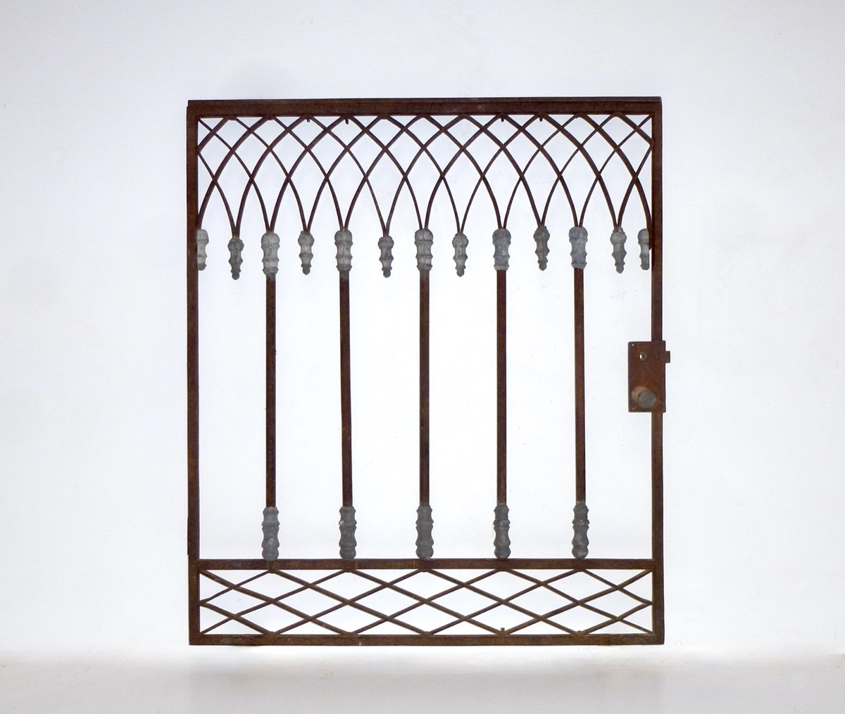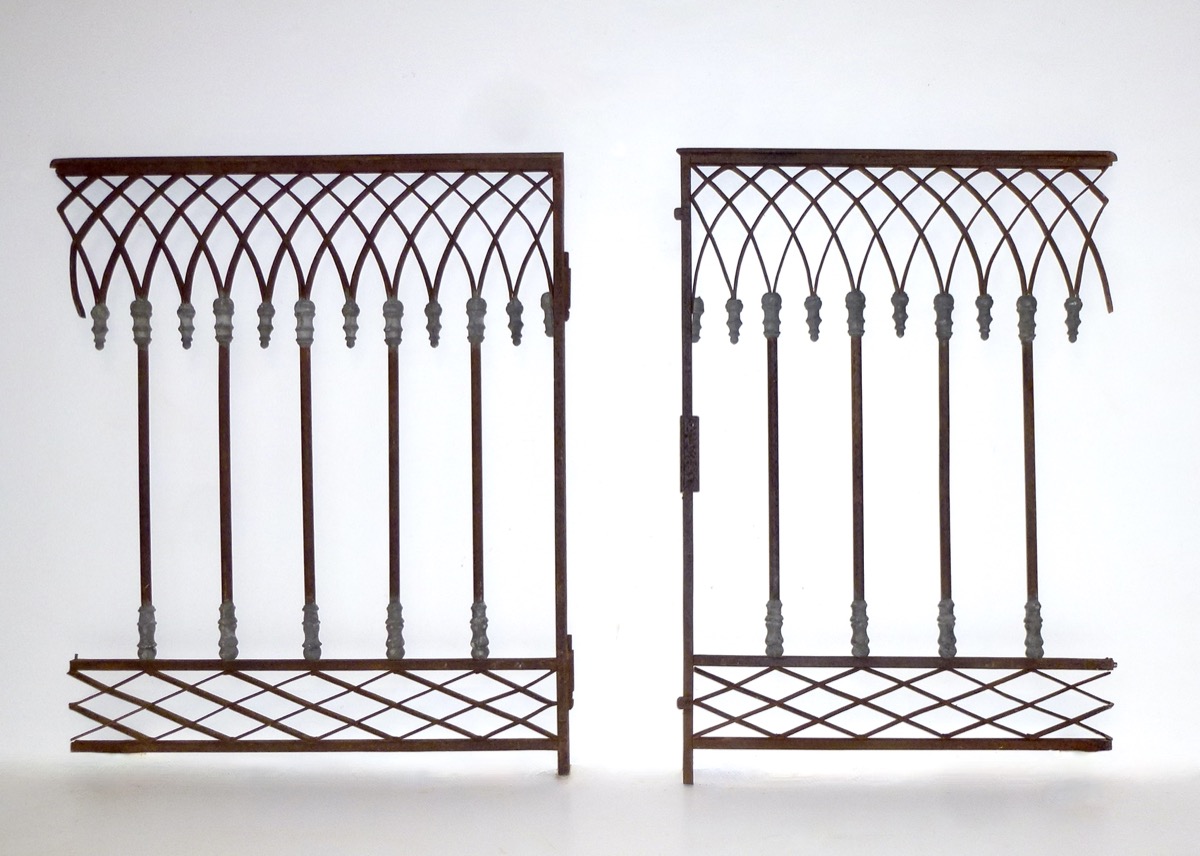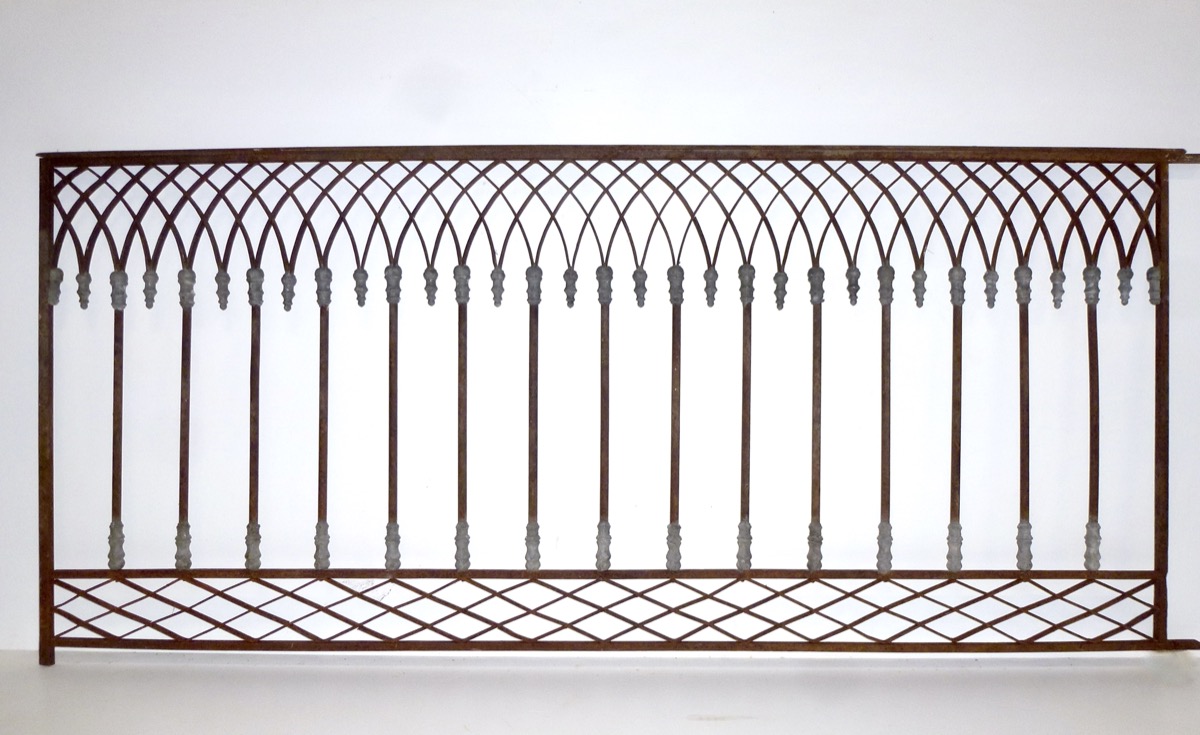 Garde-corps en fer forgé de remarquable facture, datant du premier quart du XIXème siècle, en parfait état de style gothique. Il est architecturé de deux jeux de voutes d'ogive entrecroisées prenant appui sur des barreaux bagués à l'instar d'une colonnade et alternativement sur des culs-de-lampe moulurés, une frise inférieure aux losanges décore son soubassement.