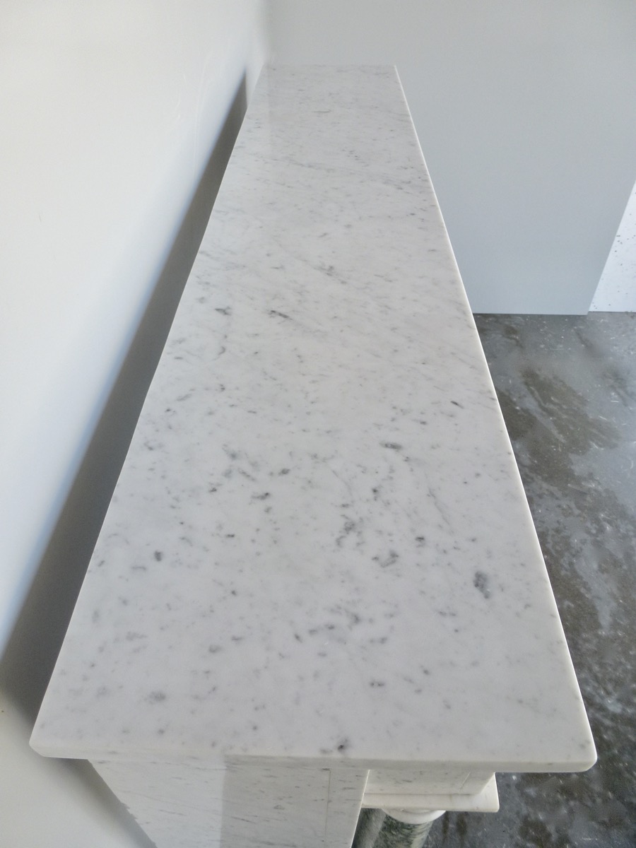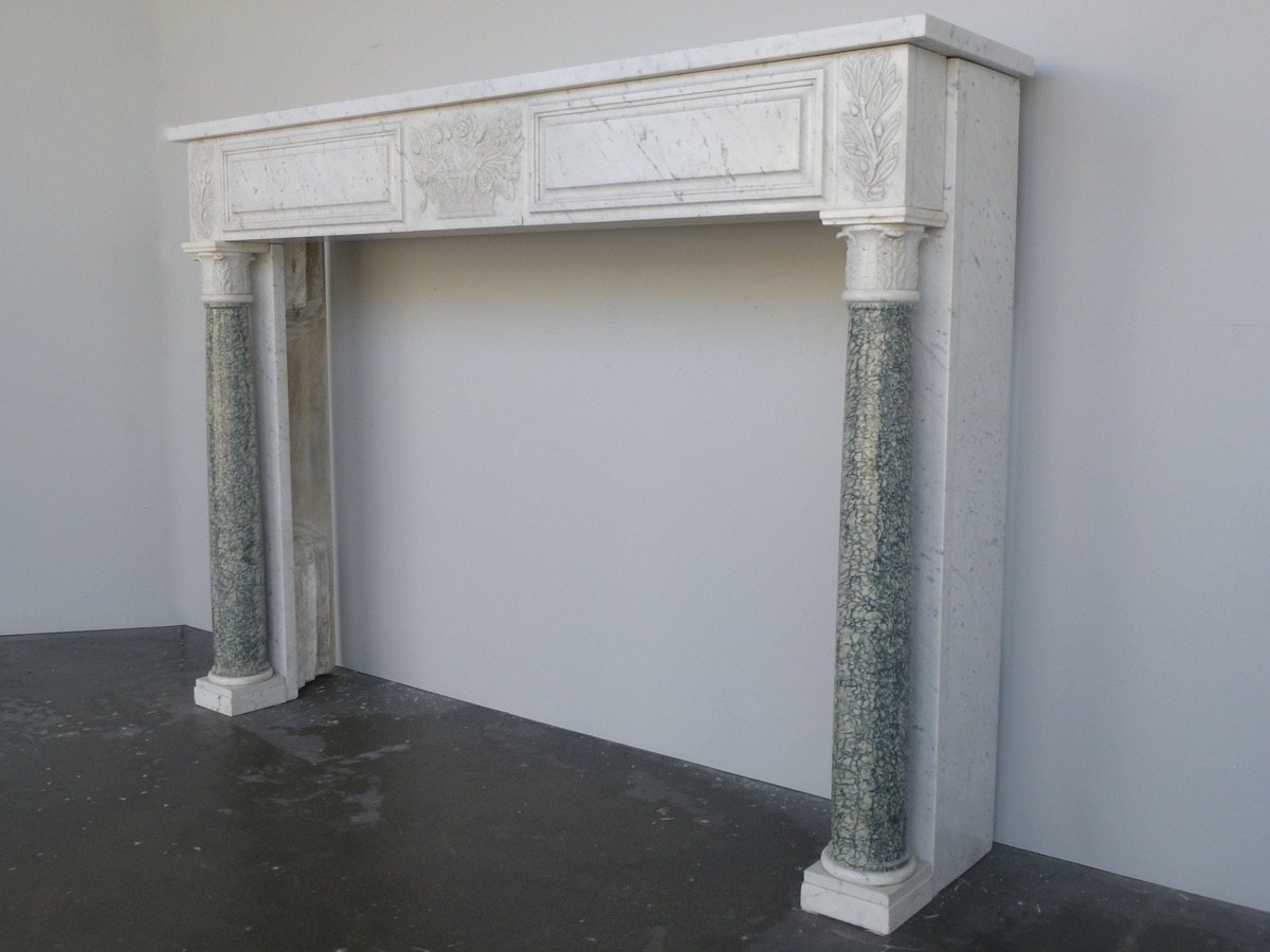 Cheminée en marbre blanc de Carrare et vert d'Estours taillée au début du XIXéme siècle, de style Empire, en parfait état. Son linteau agrémenté d'un panier fleuri en son centre accosté de réserves et de rameaux d'olivier à ses extrémités, repose sur des colonnes détachées en marbre vert d'Estours, sommées de chapiteaux décorés de feuilles d'acanthe dressées.
