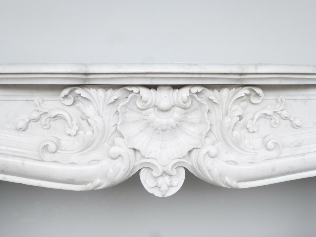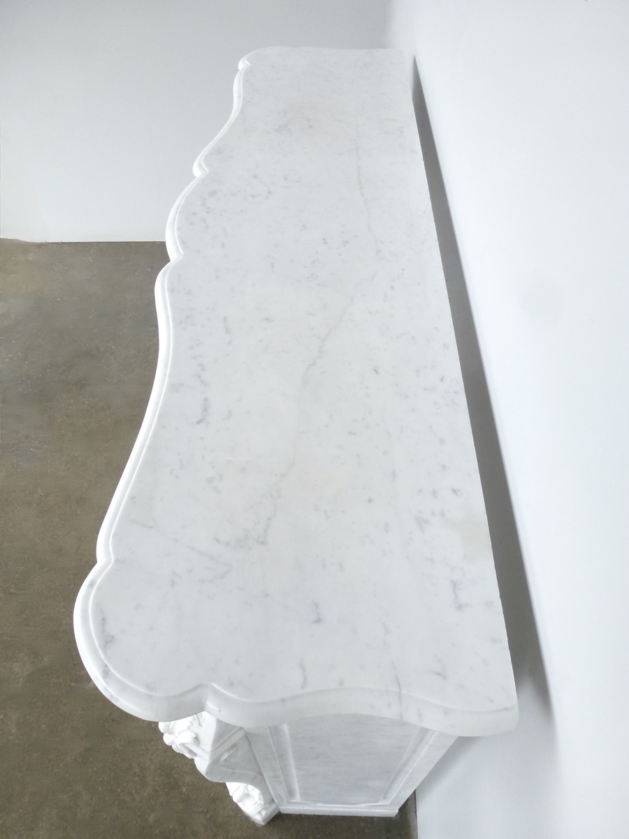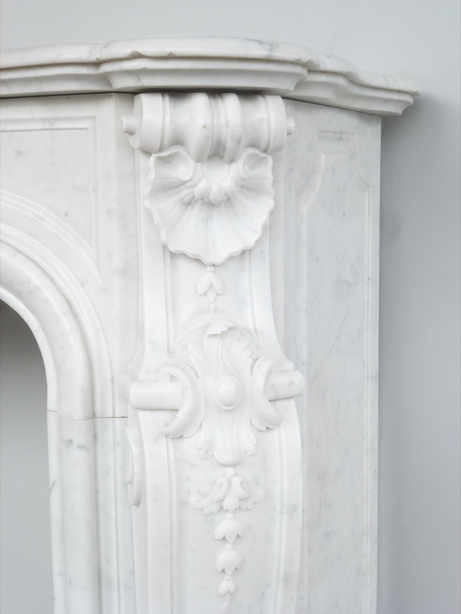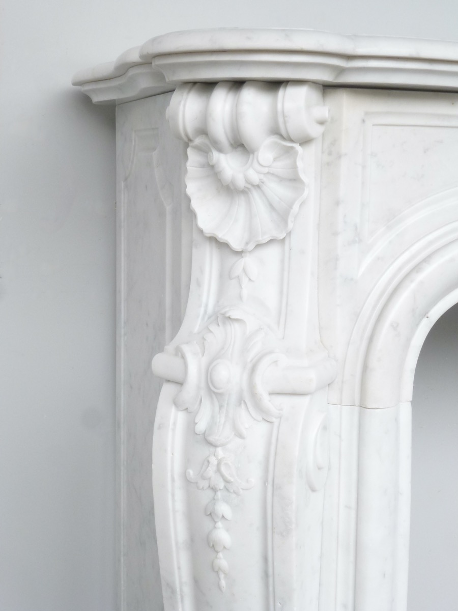 Elégante cheminée en marbre blanc de Carrare, de style Louis XV, taillée au XIXéme siècle, en parfait état.
