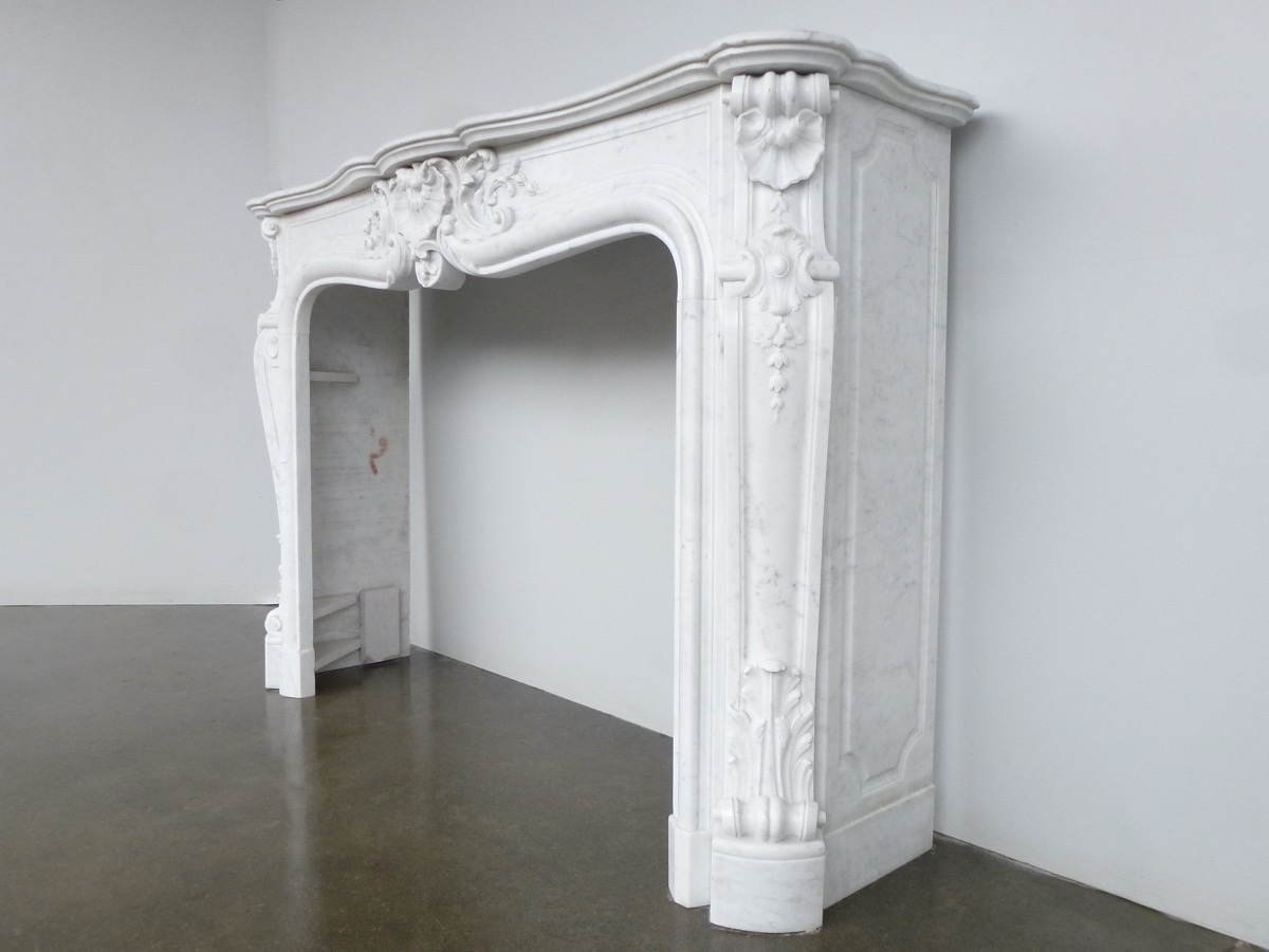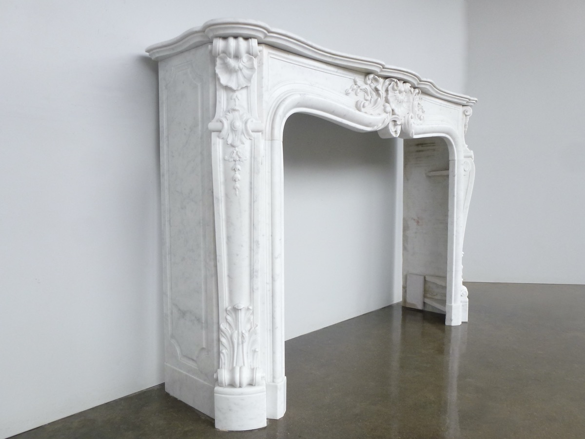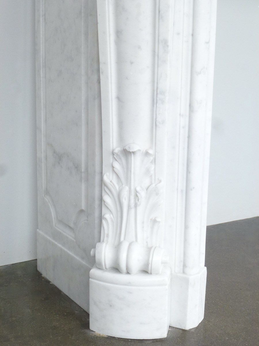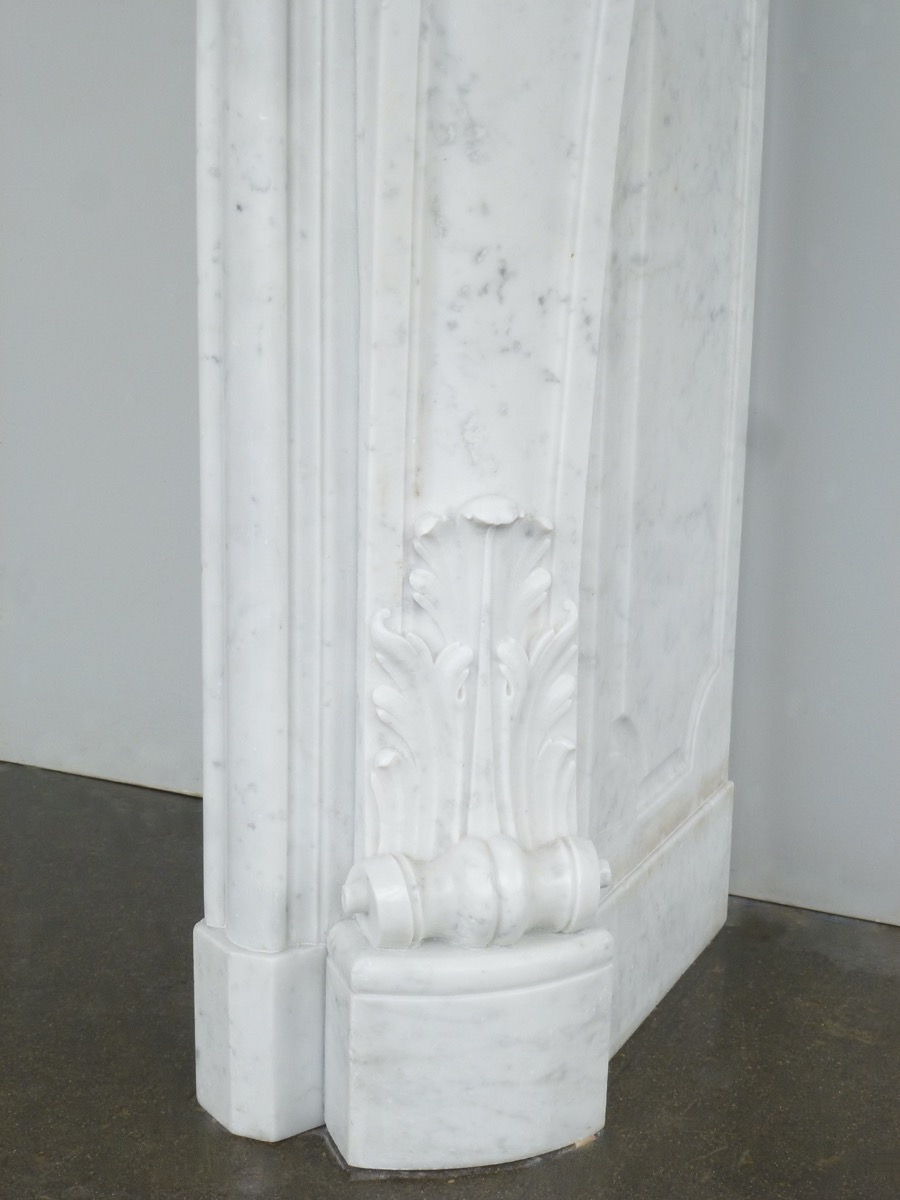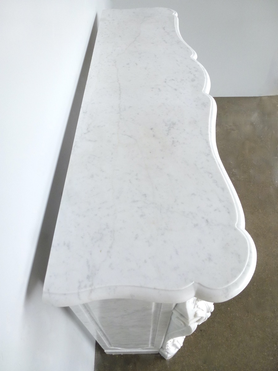 Elégante cheminée en marbre blanc de Carrare, de style Louis XV, taillée au XIXéme siècle, en parfait état.