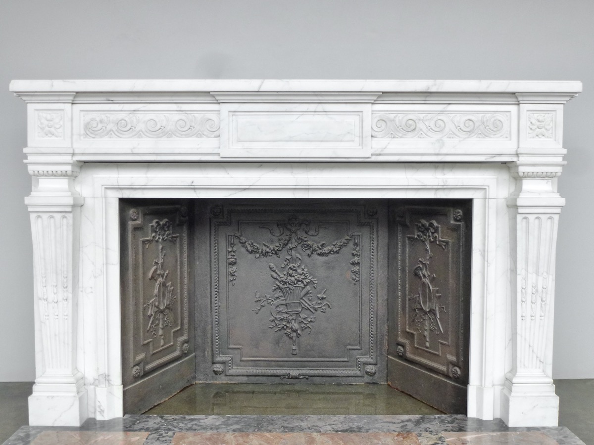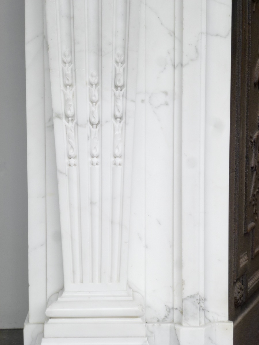Importante cheminée en marbre blanc Calacatta de style Louis XVI, Néoclassique, d'époque XIXème siècle, complète et en parfait état. De très belle facture et d'une qualité de marbre inhabituelle. Son plateau à ressaut, généreusement mouluré, épouse sa ligne. L'ensemble de sa décoration est finement sculptée comme les frises de postes ornées de feuilles et de culots de son bandeau accostant une réserve centrale, ainsi que les rosaces sur les pilastres en gaine animés de canaux aux remontées d'asperges remarquables de ses montants. Trois panneaux moulurés dont un à table agrémentent ses cotés.