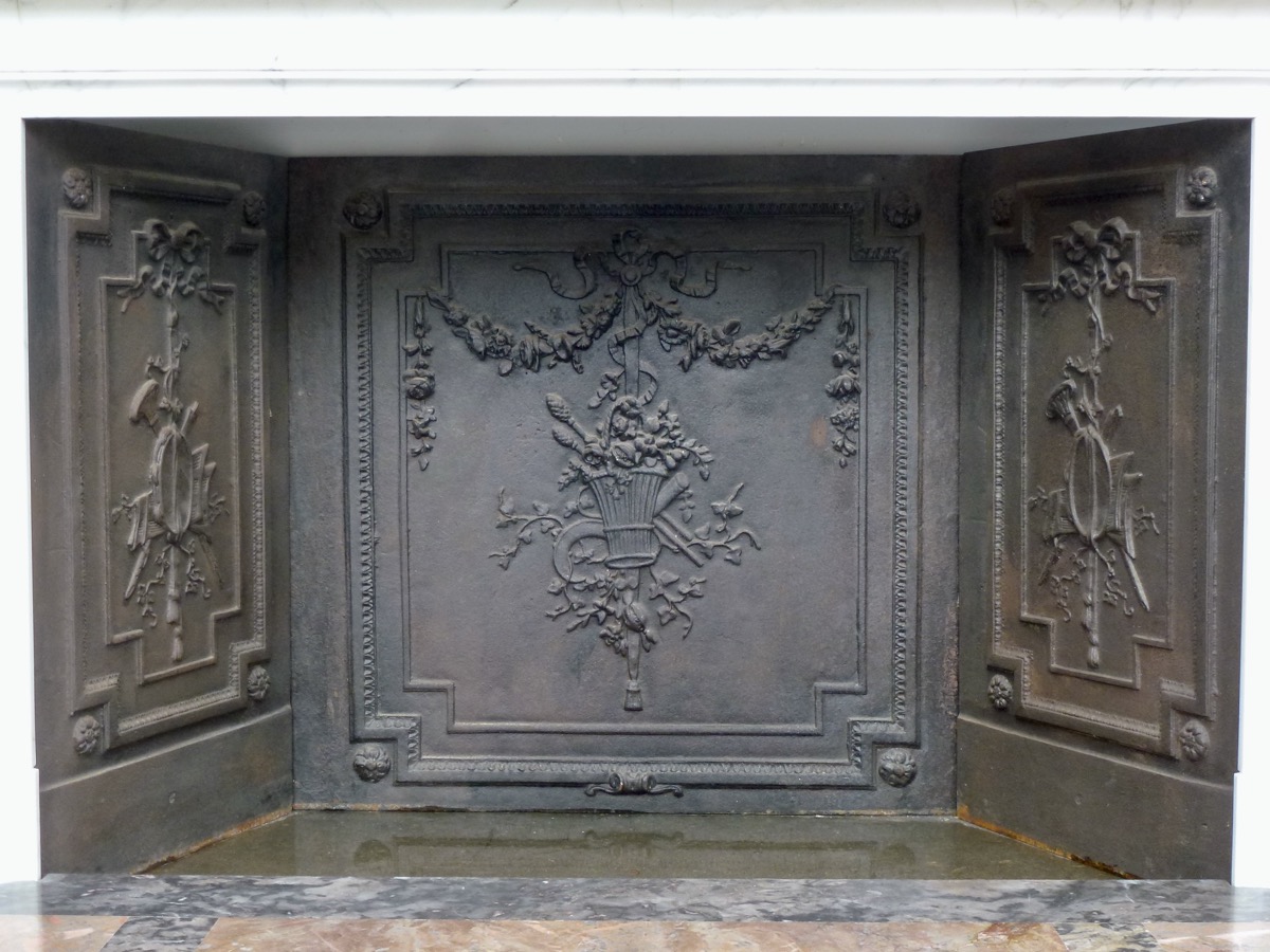 Un jeu de plaques en fonte de même style habille son foyer. Elles sont décorées pour celle du fond d'un panier fleuri brochant sur une faucille et une paire de thyrses animés de sarments de vigne, suspendu par un noeud de ruban à une guirlande de fleurs et pour ses côtés aux attributs de musique de même composition.