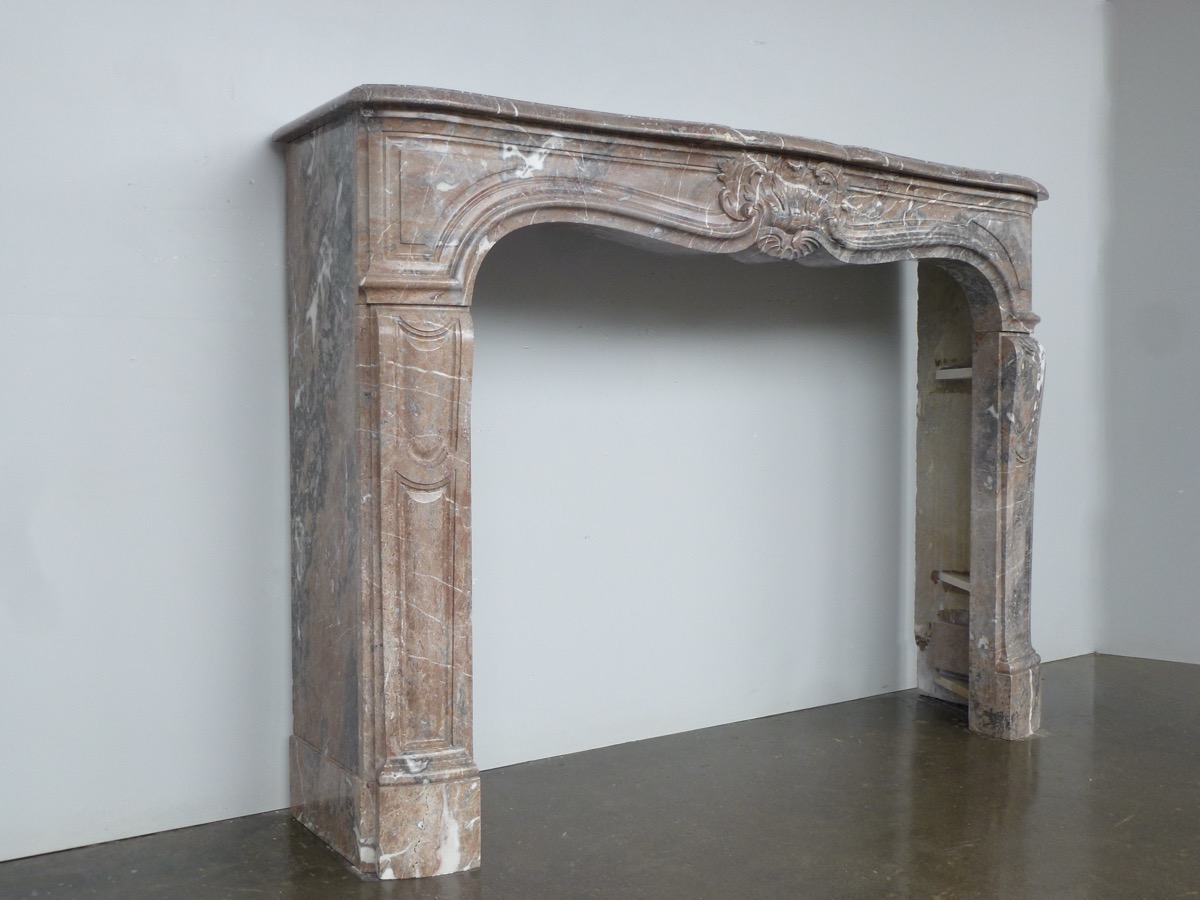 Cheminée en marbre brun de Belgique, de style Louis XV, taillée fin XIXème ou tout début XXème siècle, en parfait état. Son plateau est mouvementé comme son bandeau agrémenté d'une coquille ceinte de feuillage et accostée de réserves à table à ses extrémités. Ses montants sont sculptés de réserves à chapelle.