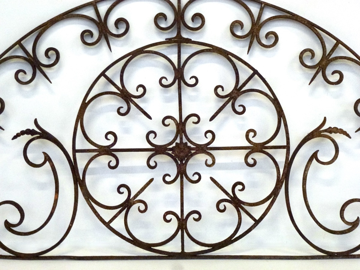 Grille d'imposte de double porte forgée au XIXéme siècle, en parfait état. Elle accueille en son centre une fleur en tôle repoussée dans une rosace au C alternés de pointes, comme sur sa périphérie, soutenue par deux crosses aux pistils naissants.