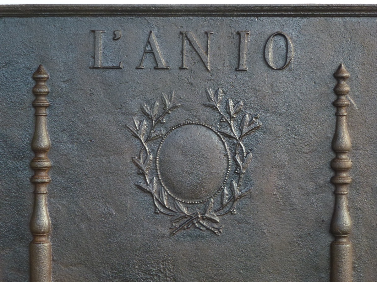 Plaque de cheminée datée de l'an 10 du calendrier républicain, soit pour notre calendrier grégorien, 1801-1802. Cette plaque est agrémenté d'un médaillon perlé ceint de rameau de laurier, deux colonnes tournées complètent sa décoration.