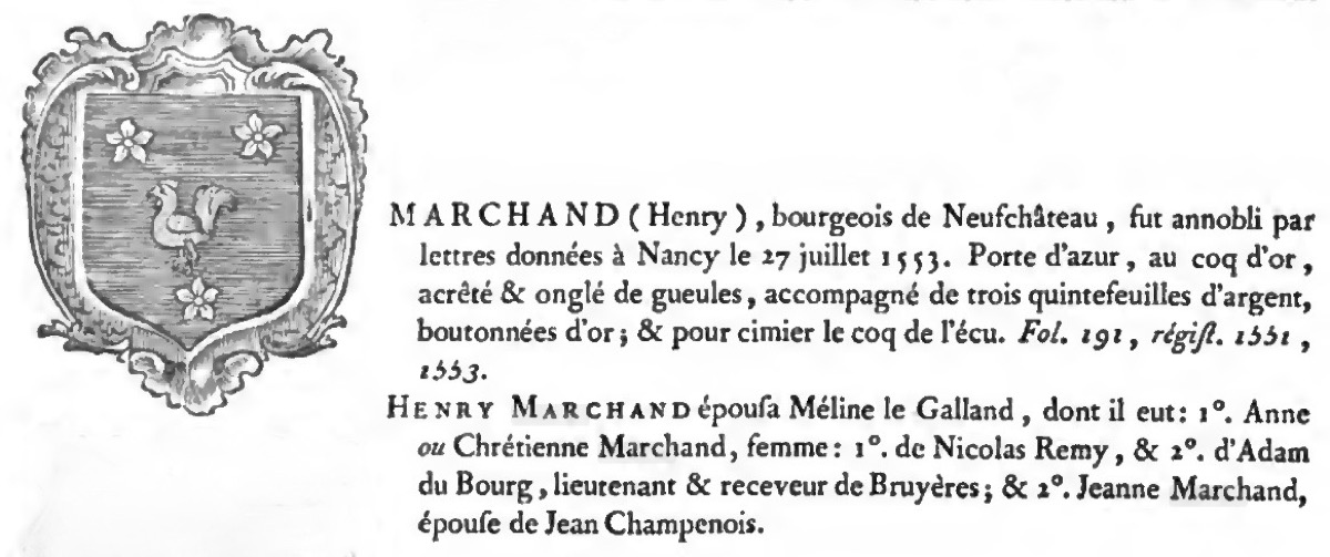 Plaque de cheminée coulée durant le dernier quart du XVIème siècle et avant 1610 aux quatre blasons de Lorraine couronnés, aux trois blasons de France et Navarre coiffés d'une couronne royale et au centre aux armes de la famille Marchand, ceintes d'un double chapeau de triomphe. Henry Marchand, 1505 - ?,bourgeois de Neufchâteau, marié à Méline le Galland, fut anobli en 1553.