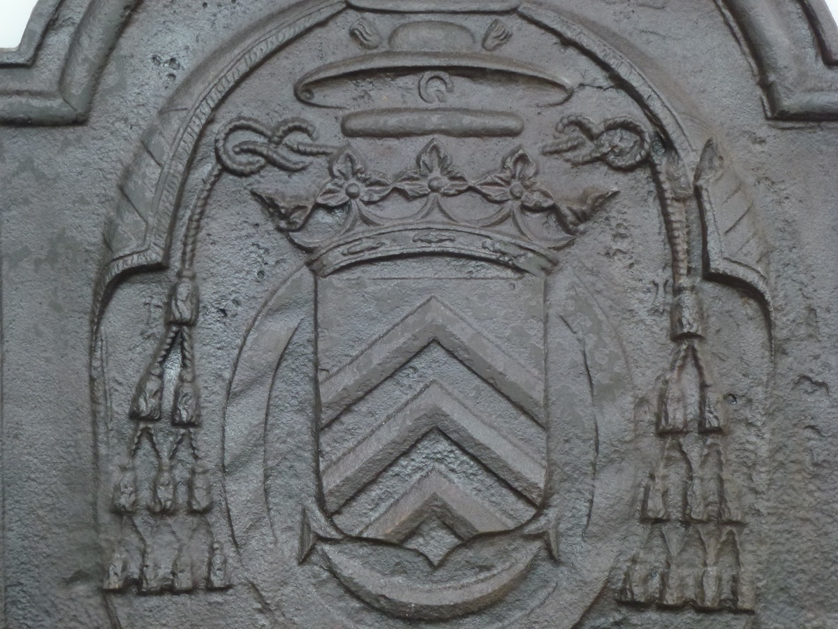 Rare plaque de cheminée datant du deuxième quart du XVIIème siècle, aux grandes armes d'Armand Jean du Plessis, cardinal-duc de Richelieu et de Fronsac 1585-1642, évêque de Luçon en 1605, au service de la régente, Marie de Médicis, elle le fait nommer en 1615, grand aumônier auprès de la jeune reine, l'infante Anne d'Autriche, puis intronisé cardinal en 1622, principal ministre de Louis XIII en 1624 jusqu'à sa mort en 1642, date à laquelle le cardinal Mazarin lui succède.
