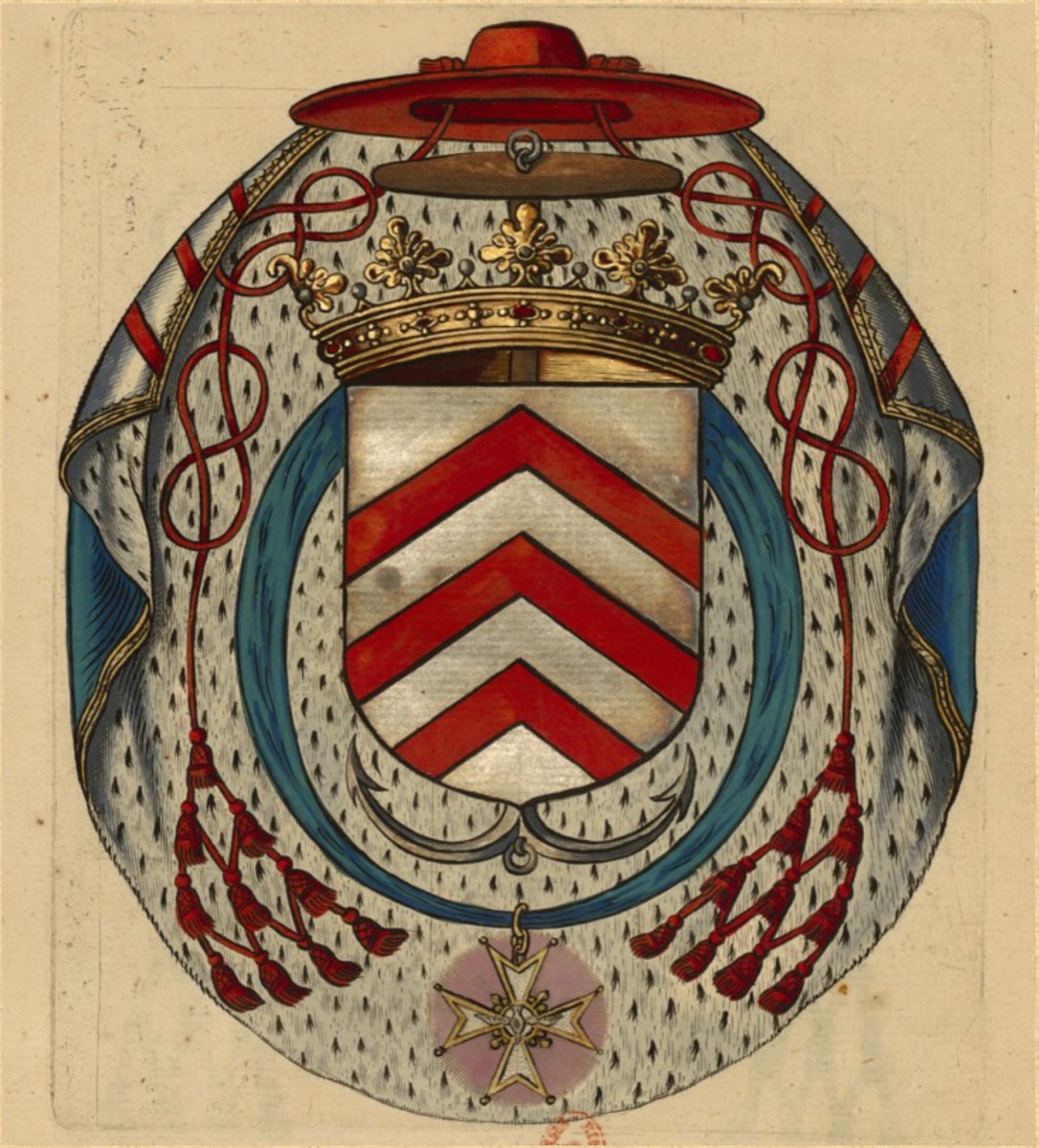 Couronne de duc et manteau de Pair, l'écu posé sur une ancre est entouré du cordon de l'ordre de Saint-Esprit et surmonté d'un chapeau de vingt houppes.