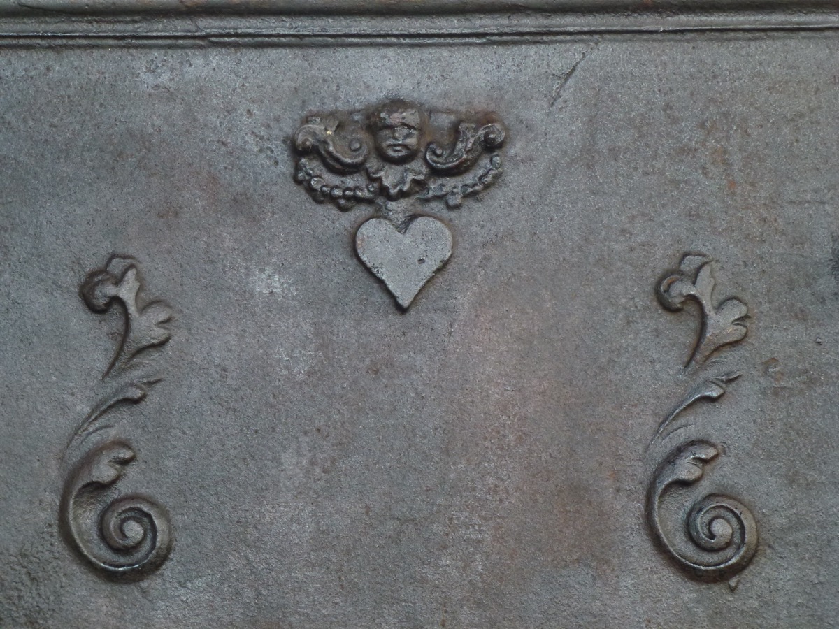 Plaque de cheminée aux attributs typiquement franc-comtois, datée 1741, d'époque XVIIIème siècle, agrémentée en son centre d'un cœur sommé d'un angelot et d'une paire colonnes, de part et d'autre, également sommées du même angelot. Un jeu de volutes aux rinceaux complètent sa décoration.