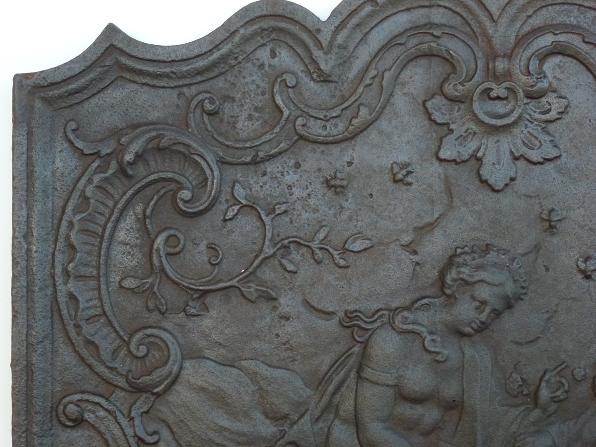 Plaque de cheminée au sommet chantourné, d'époque Louis XV, dans le goût de la Rocaille, en bel état, représentant Vénus et l'Amour piqué par une abeille, ce dernier ayant laissé son arc et son carquois au sol. Une nuée d'abeilles couvre le champ de la plaque, la scène est encadrée de motifs au canon artistique de cette époque.