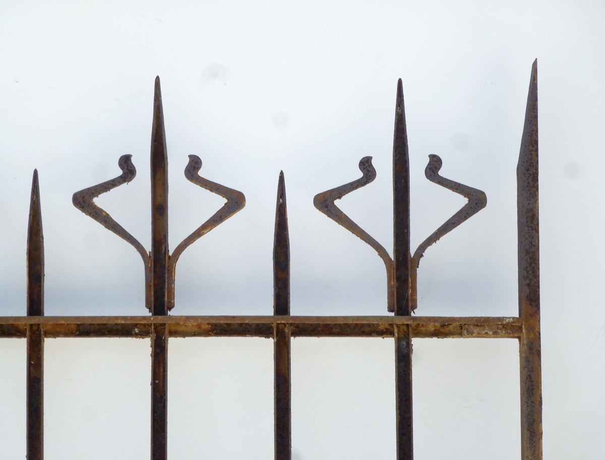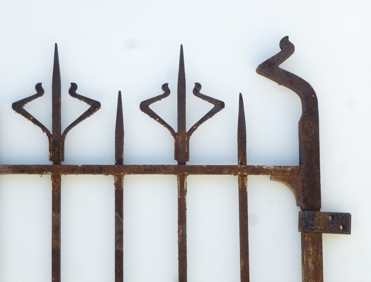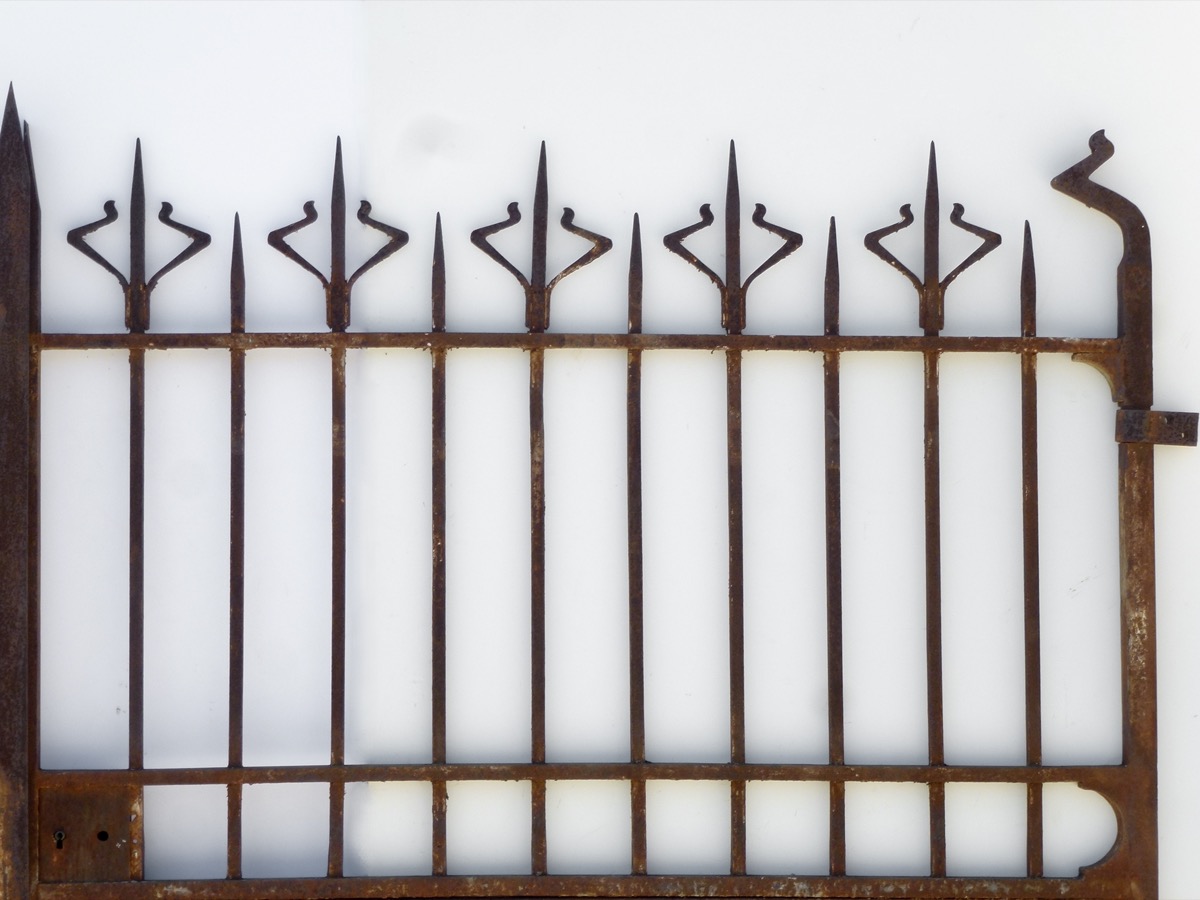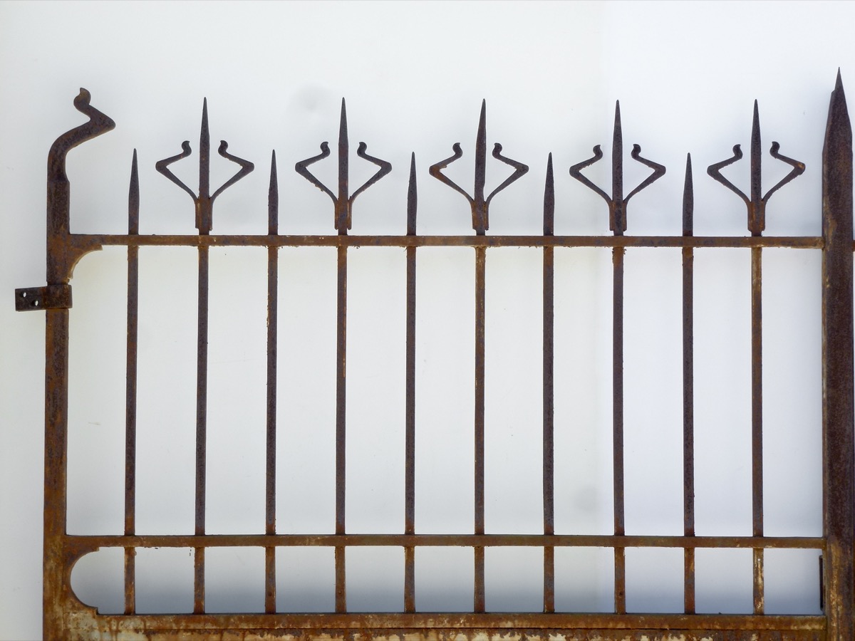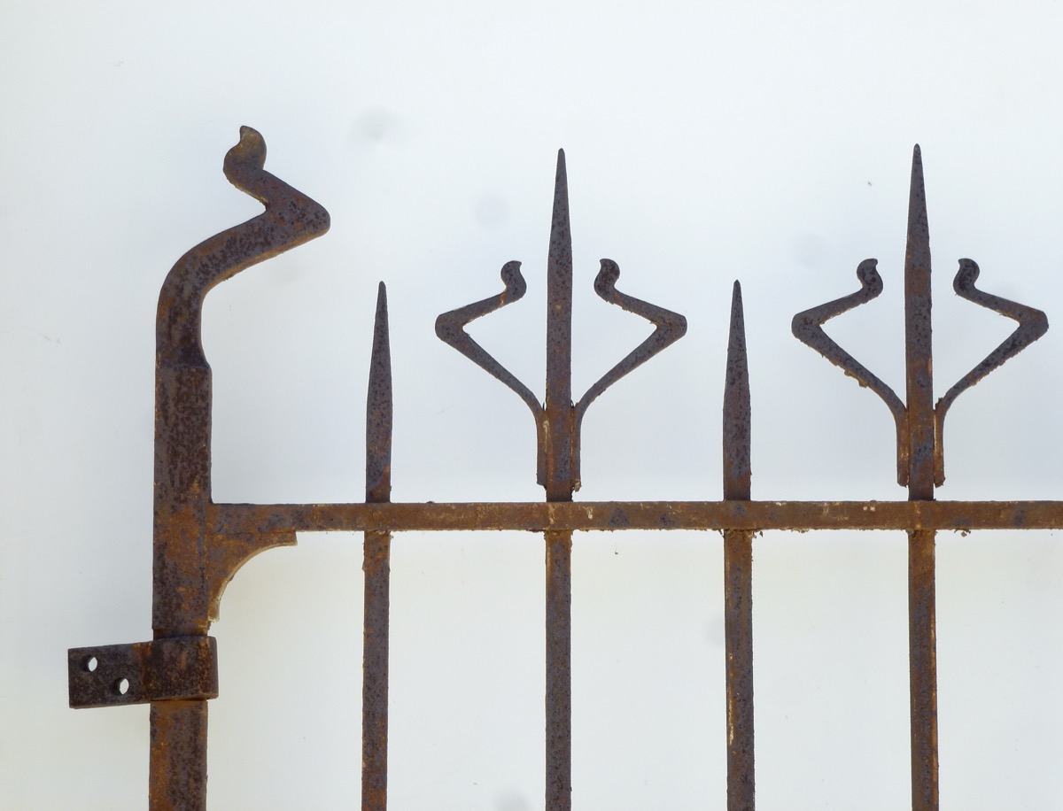Portail en fer forgé d'époque Art Nouveau, façonné vers 1900, dont les tôles inférieures sont à changer. Les cadres de 40 mm² et de 40 x 20 mm, en fer plein, sont en bon état, comme ses barreaux en fer profilé en U. Trois pics supérieurs ont été redressés. La hauteur des montants latéraux est de 201 cm pour une hauteur à l'axe des gonds de 161 cm.