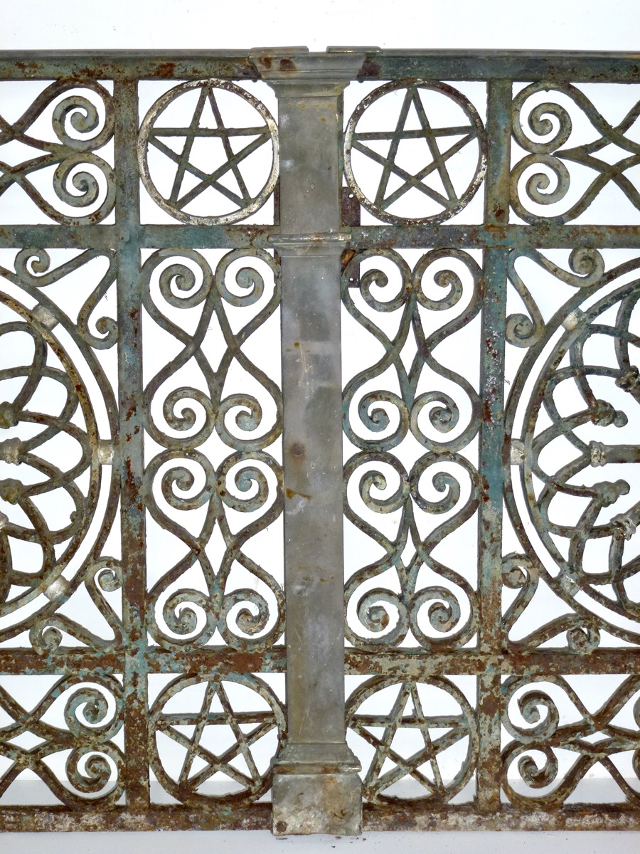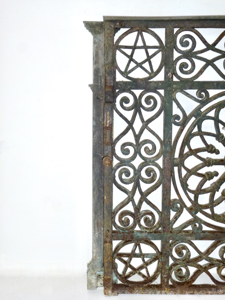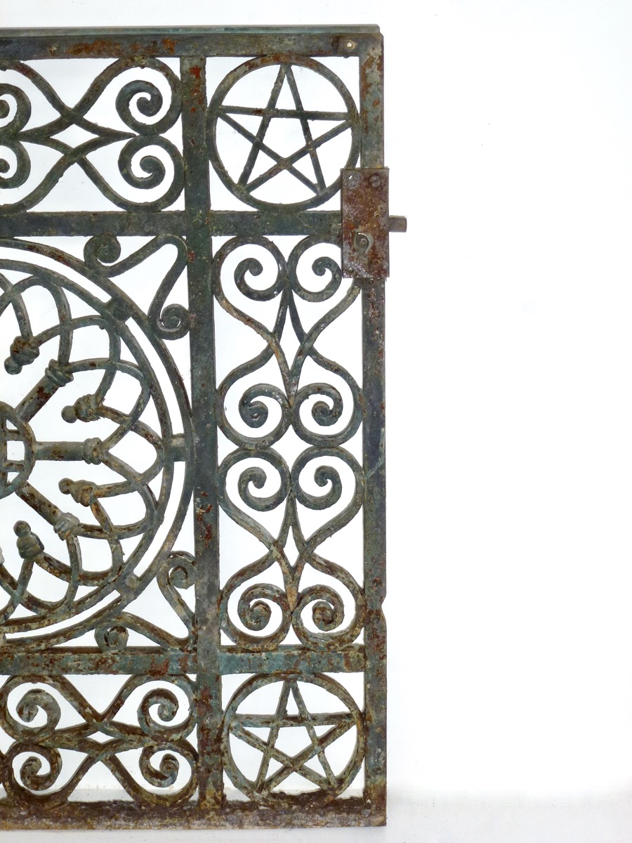 Paire de portillons en fer forgé, de très belle facture, datant du premier quart du XIXème siècle. Leurs centres accueillent une rosace aux rayons liés d'ogives entrecroisées d'un autre jeu à pendeloque. Leurs cadres aux angles ornementés d'un pentagramme ou étoile de Salomon sont décorés de cœurs inversés entrecroisés. Ses vantaux sont enrichis d'une main courante et d'une battue en bronze moulurées.