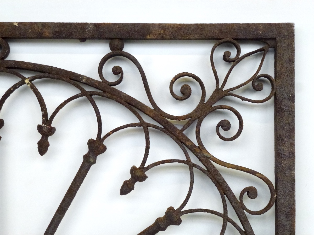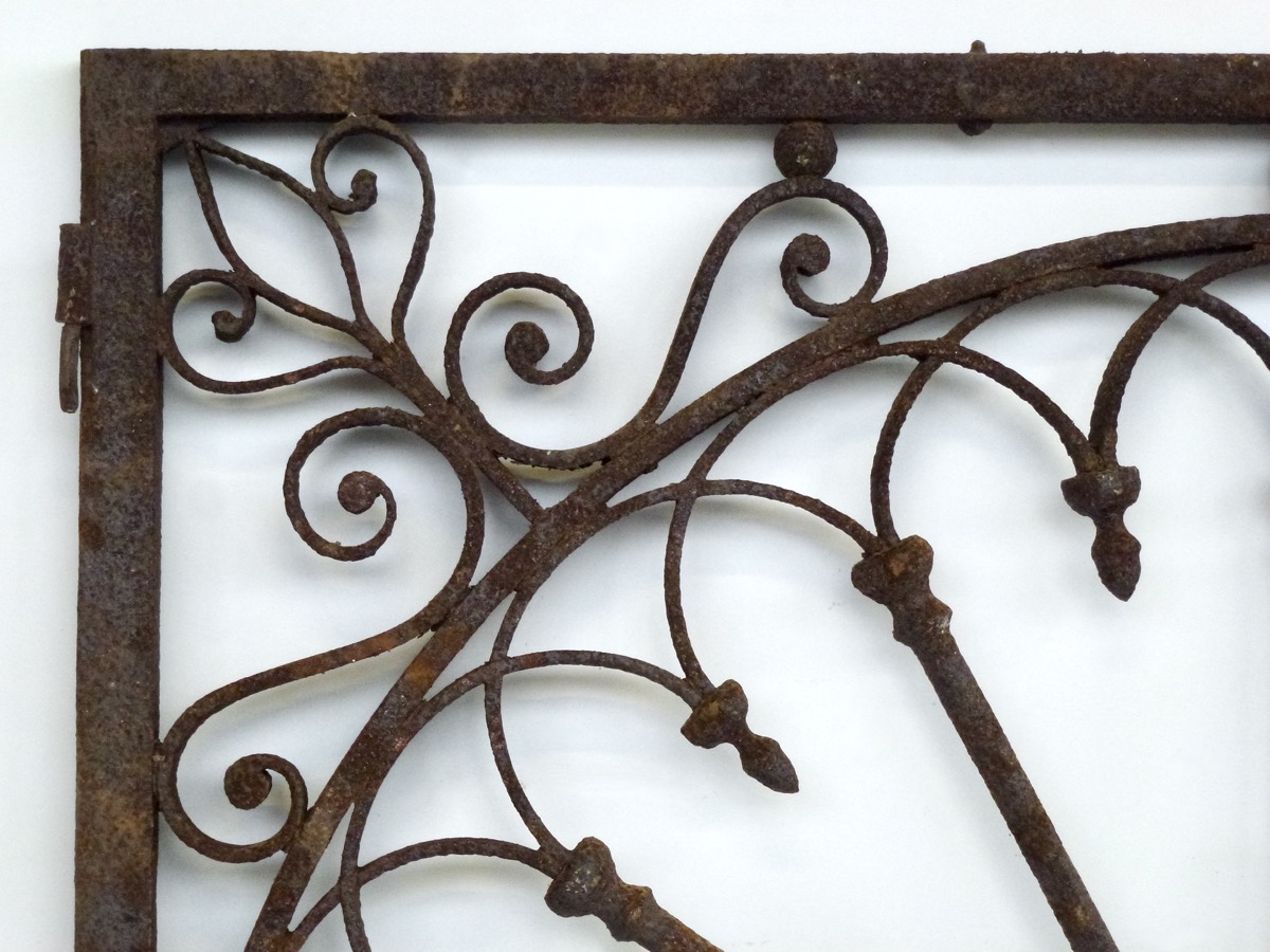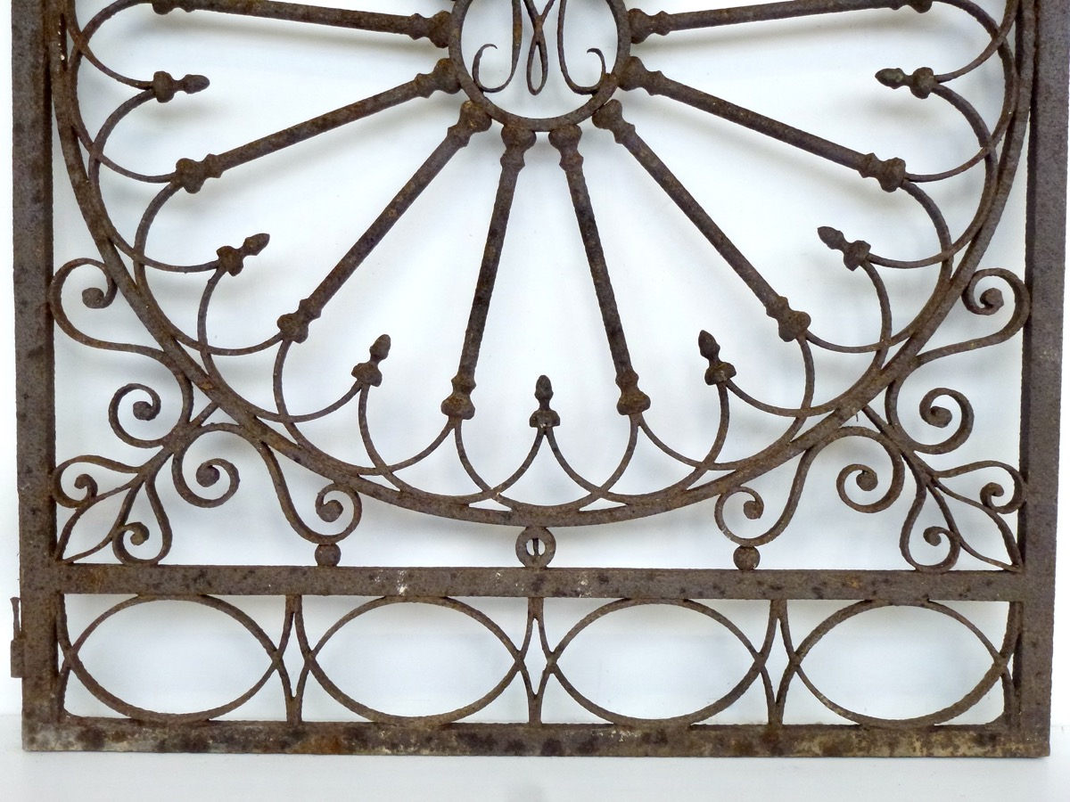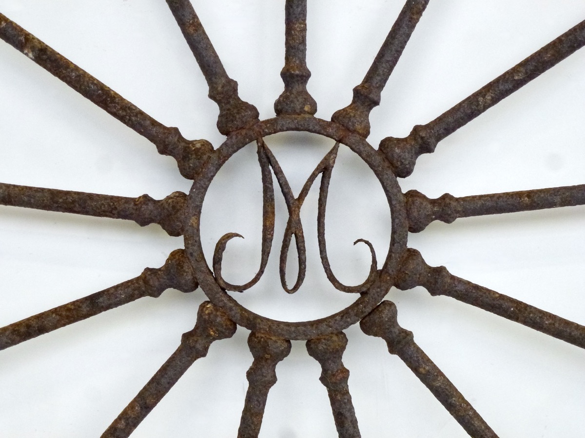 Elégant portillon forgé au début du XIXème siècle en parfait état, agrémenté d'une rosace, au centre chargé d'un monogramme "M", aux rayons liés d'arcs entrecroisés d'un autre jeu à cul-de-lampe. Ses angles sont décorés d'écoinçons fleuris et de volutes inversées à noyaux pleins. En partie inférieure, une frise de demi-cintre affrontés et entrecroisés complètent sa décorations. L'ensemble est monté mi-fer et riveté.