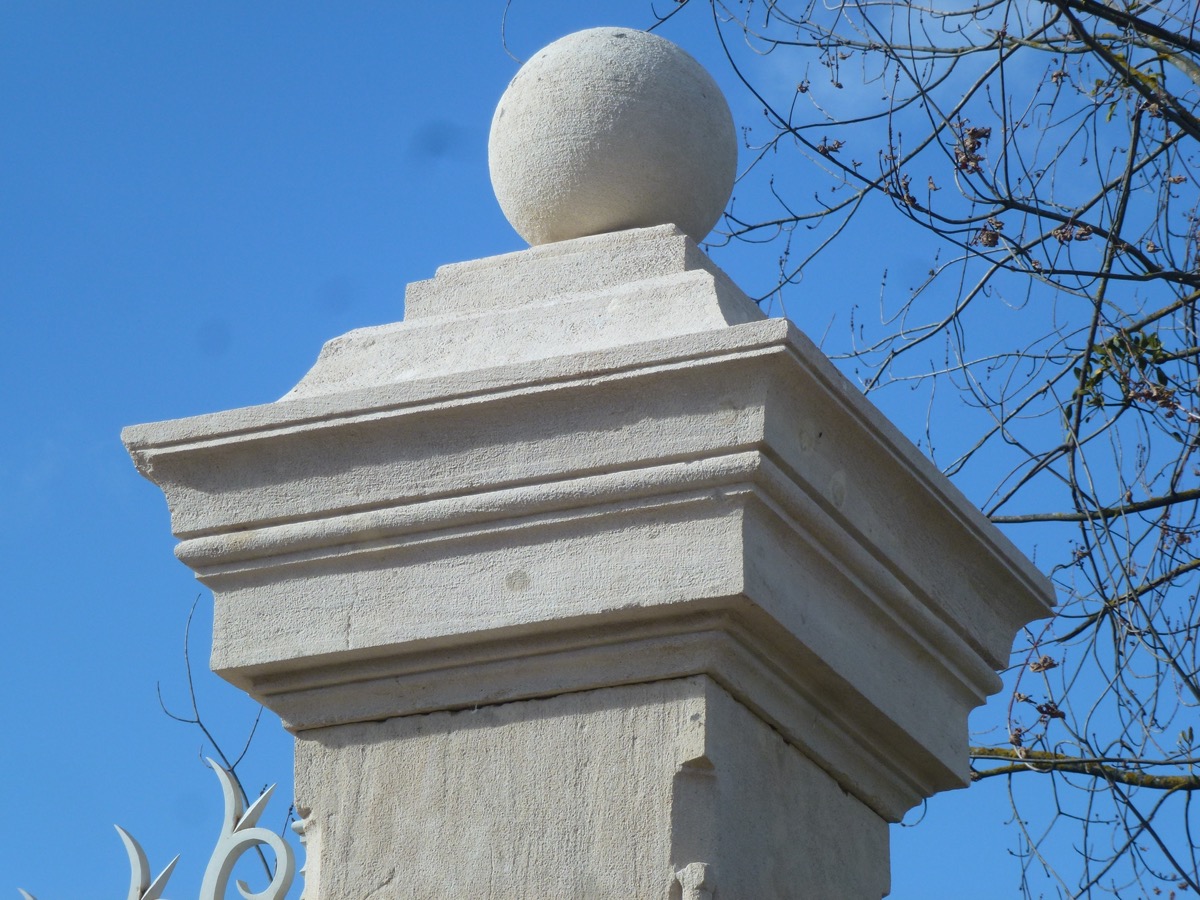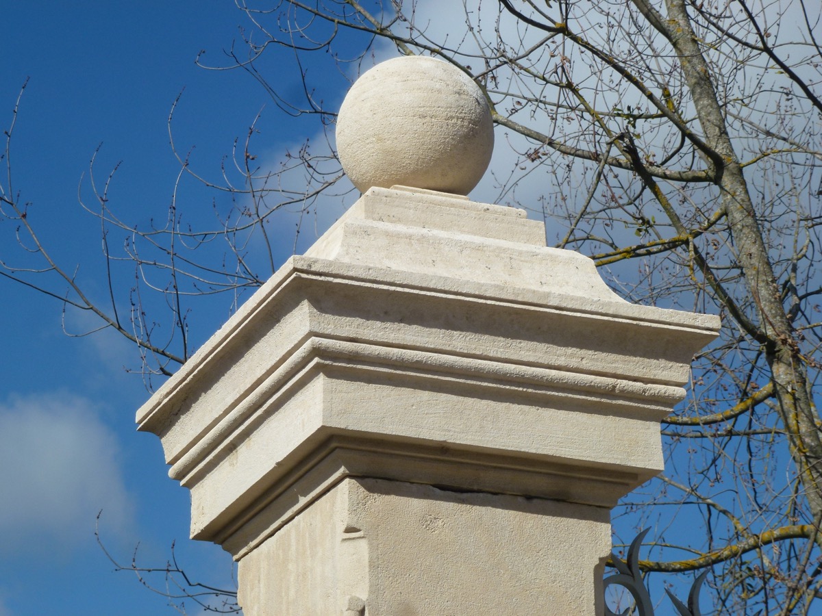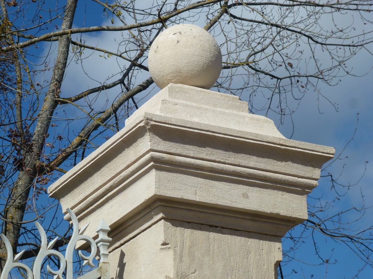 Ses piliers en pierre de Farges (Saône et Loire), d'une hauteur sous chapiteau de 347 cm, d'une section de fût de 53,5 x 58 cm, sont coiffés de généreux chapiteaux ornés d'une sphère.