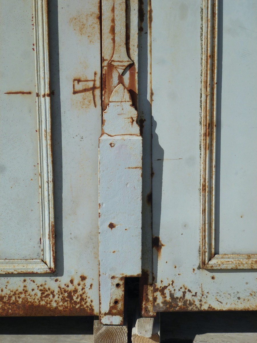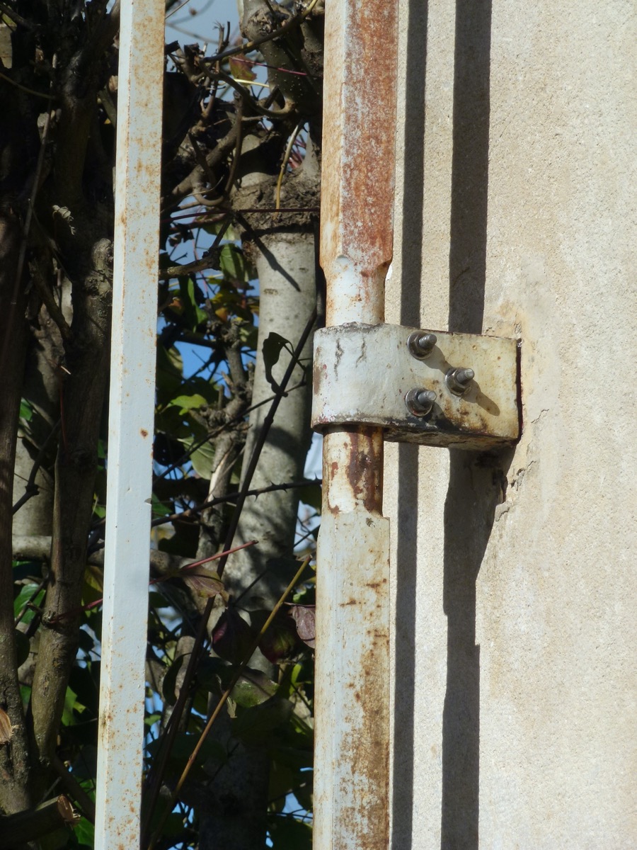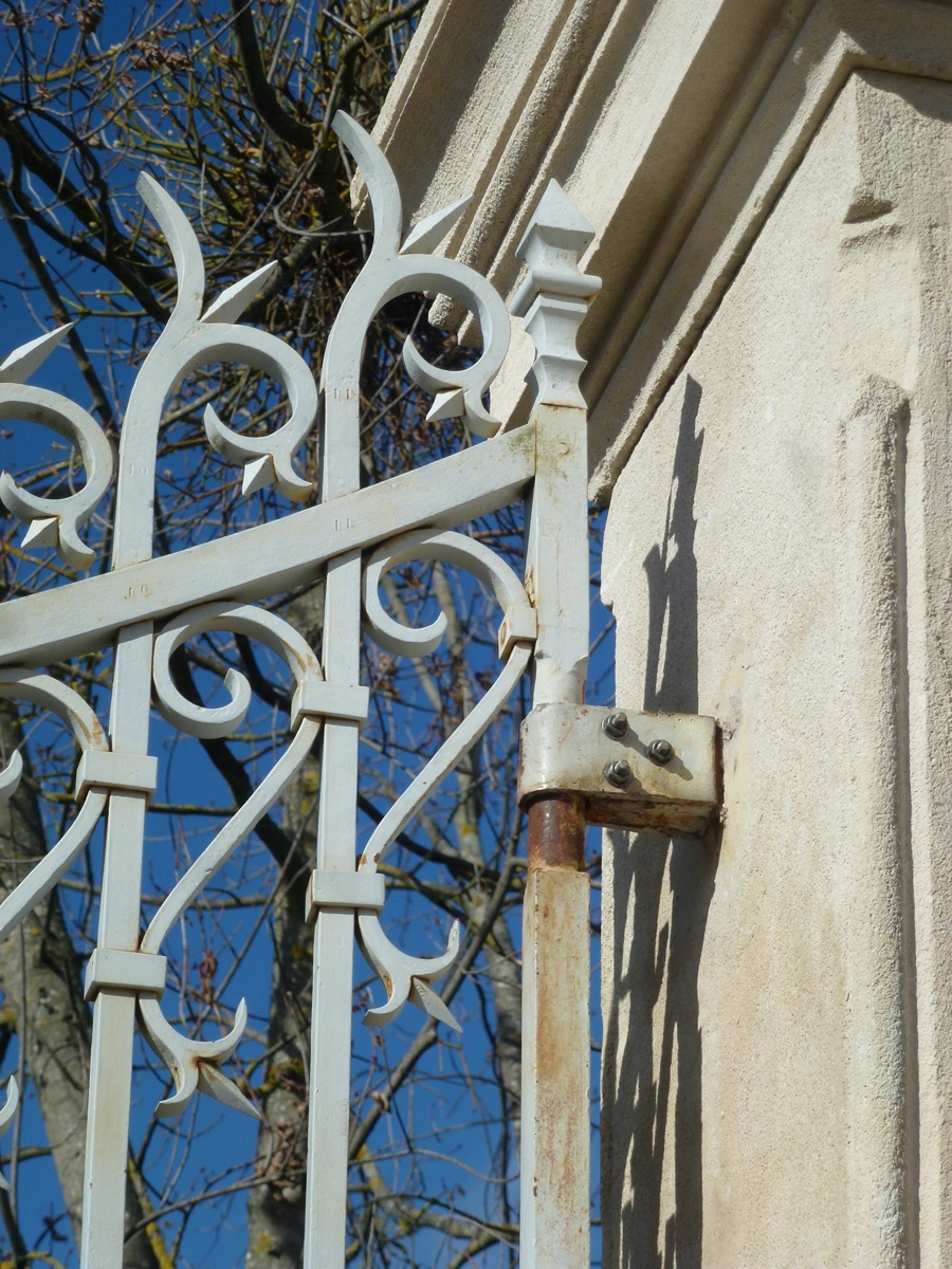 Son portail au sommet concave dispose d'une largeur de 340 cm, dont les tôles inférieures, de un mètre de hauteur, ont été changées à l'identique. Il est à noter un très beau travail de croisillons, montés mi-fer, sur les faces intérieures, voir notre dernière photo. Il a été motorisé et équipé d'une serrure électrifiée (nous ne disposons pas de clé). Ce portail est monté sans aucune soudure, son sommet est agrémenté d'une herse aux crosses fleurdelisées, comme son jeu de volutes baguées. Son centre est orné d'un trèfle évidé entre une composition de feuilles et d'enroulements. Une frise médiane est ordonnée de cercles flammés. D'une hauteur latérale de 352 cm et de 327 cm au trèfle, la section des cadres est de 37 mm², celle des barreaux est de 22 mm².