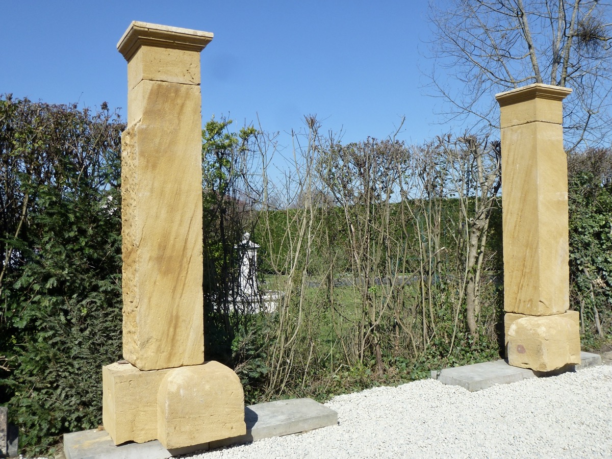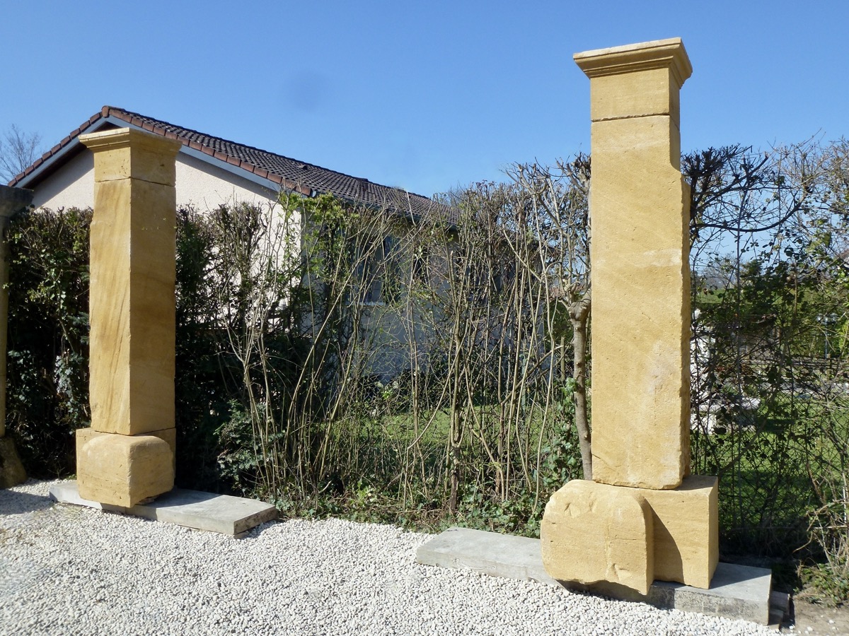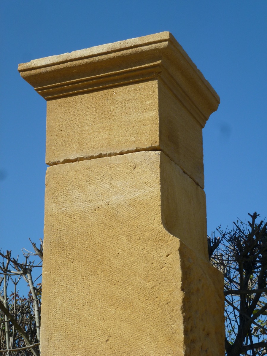 Paire de piliers de portail en pierre beaujolaise, taillés au XIXème siècle, en parfait état, prêts à être installés. Ses bases de 66 cm de largeur, de 50 cm de profondeur, pour 52 cm de hauteur, disposent de généreux chasse-roues saillants 23 cm. Les fûts d'une section de 50 cm² sont coiffés de chapiteaux moulurés sur trois côtés. La hauteur sous chapiteau est de 264 cm, plus 26 cm de partie droite sous la moulure des chapiteaux, soit 290 cm de partie droite.