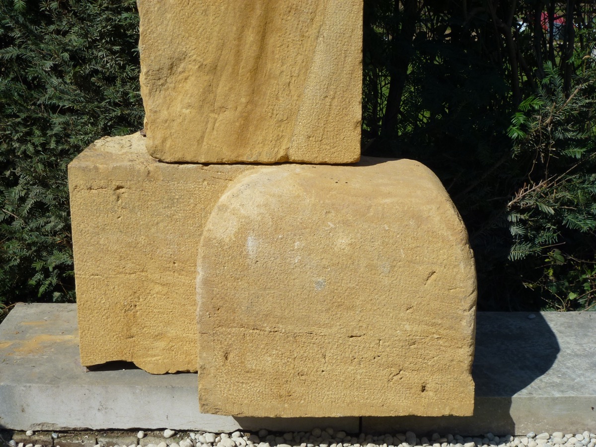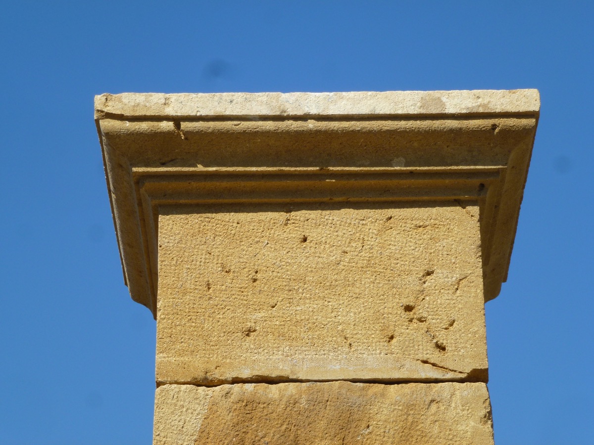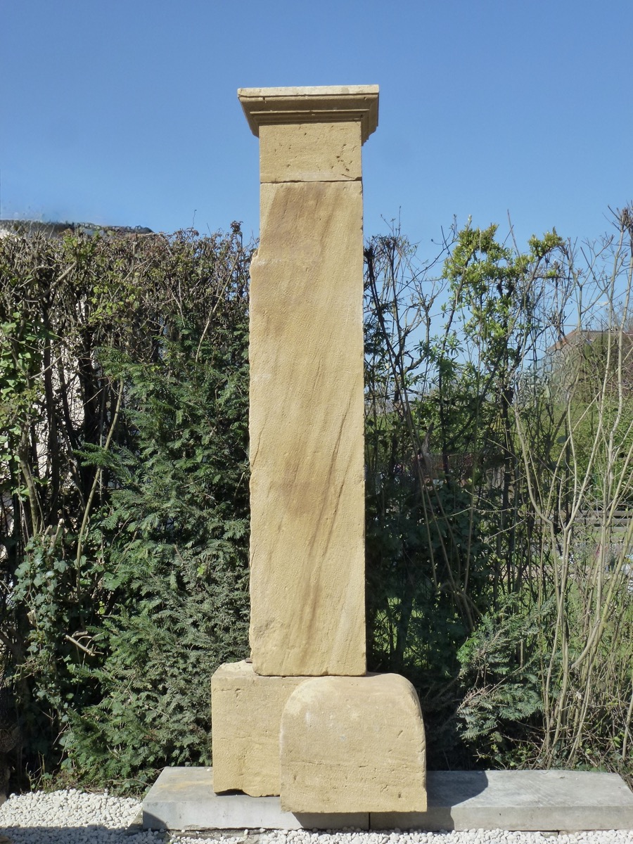 Paire de piliers de portail en pierre beaujolaise, taillés au XIXème siècle, en parfait état, prêts à être installés. Ses bases de 66 cm de largeur, de 50 cm de profondeur, pour 52 cm de hauteur, disposent de généreux chasse-roues saillants 23 cm. Les fûts d'une section de 50 cm² sont coiffés de chapiteaux moulurés sur trois côtés. La hauteur sous chapiteau est de 264 cm, plus 26 cm de partie droite sous la moulure des chapiteaux, soit 290 cm de partie droite.