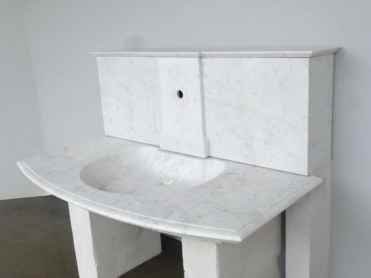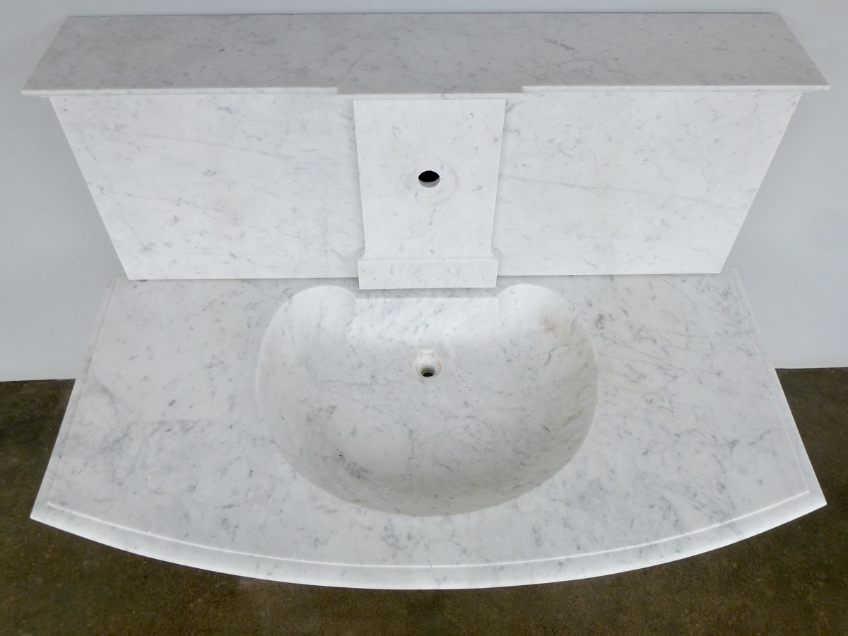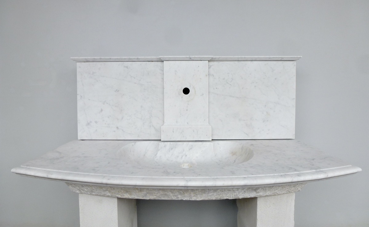 Vasque de rafraîchissoir en marbre blanc de Carrare taillée au XIXème siècle en parfait état. Sa vasque en rognon d'une dimension de 57 cm x 42 cm d'une profondeur de 9 cm est façonnée dans un plan en demi-lune mouluré. Sa crédence à ressaut central est coiffée d'un plateau de 115 cm de longueur et de 21 cm de profondeur.