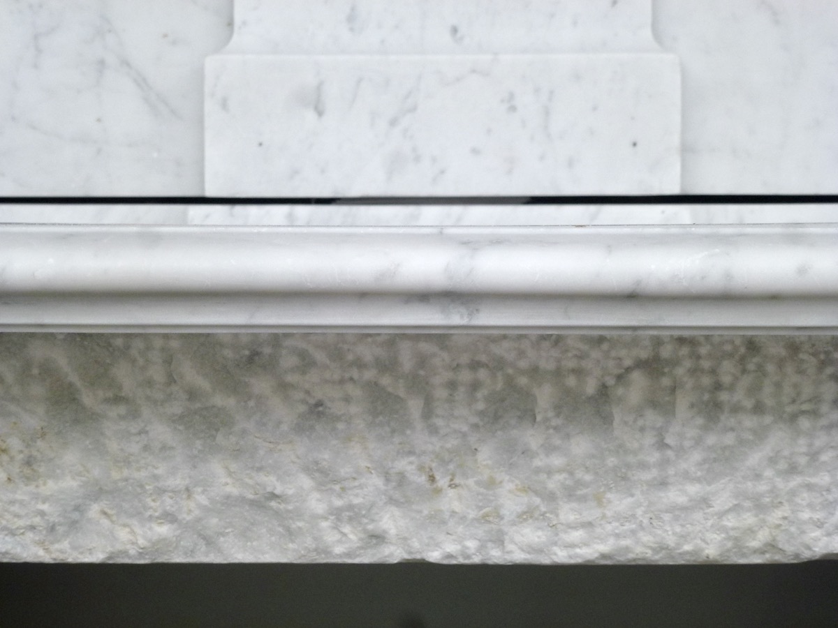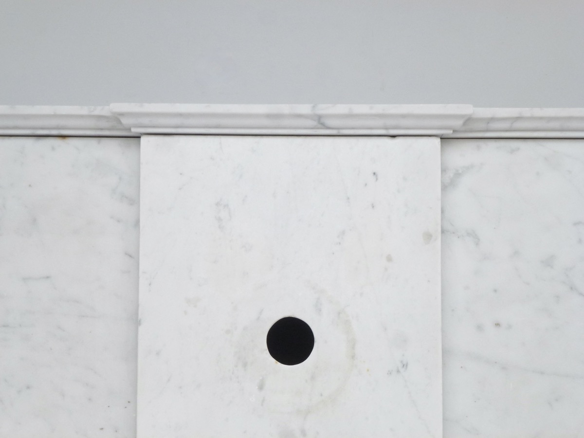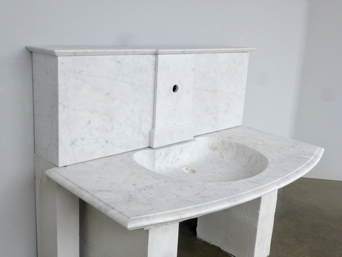 Vasque de rafraîchissoir en marbre blanc de Carrare taillée au XIXème siècle en parfait état. Sa vasque en rognon d'une dimension de 57 cm x 42 cm d'une profondeur de 9 cm est façonnée dans un plan en demi-lune mouluré. Sa crédence à ressaut central est coiffée d'un plateau de 115 cm de longueur et de 21 cm de profondeur.